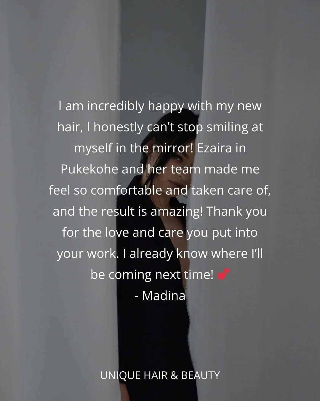 “I had been going to Unique Hair for a couple of years at the Flat Bush salon. I was thrilled to know there was a new salon opening up in Pukekohe, as we recently moved to Pokeno. I always leave the salon happy, and the pricing for the work they do, is affordable and competitive! Make an appointment to go see these guys - they’re awesome 🙌”